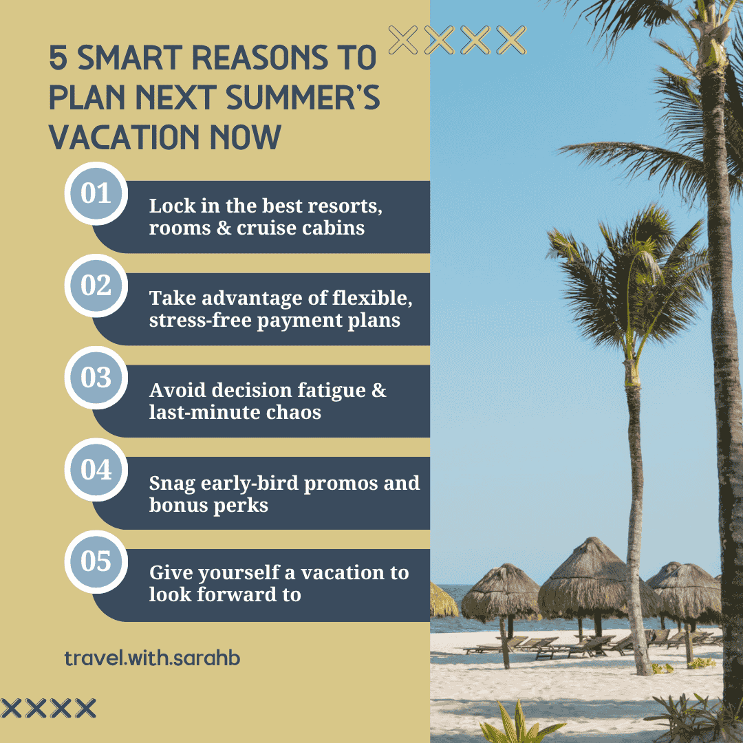 Most vacations can be secured with a deposit and paid off over time. Planning now means you’ll have 9–12 months to spread out your payments, making that big trip feel way more manageable.